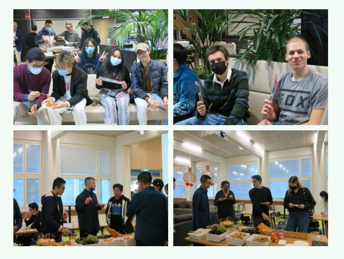 电气ST201班刘炫志同学和计ST201班于汉泽同学为大家生动讲解了中秋节的起源、文化内涵与风俗习惯。一场别开生面的“击鼓传月饼”游戏将现场氛围推向高潮,拿到月饼的同学通过回答有关中秋节的文化知识,领取筷子作为奖励。能源ST201班苏建坤同学与王萌同学为大家献唱《白月光与朱砂痣》,在轻松愉快的氛围中,中外师生品尝中秋节传统美食月饼,交流讨论,其乐融融。